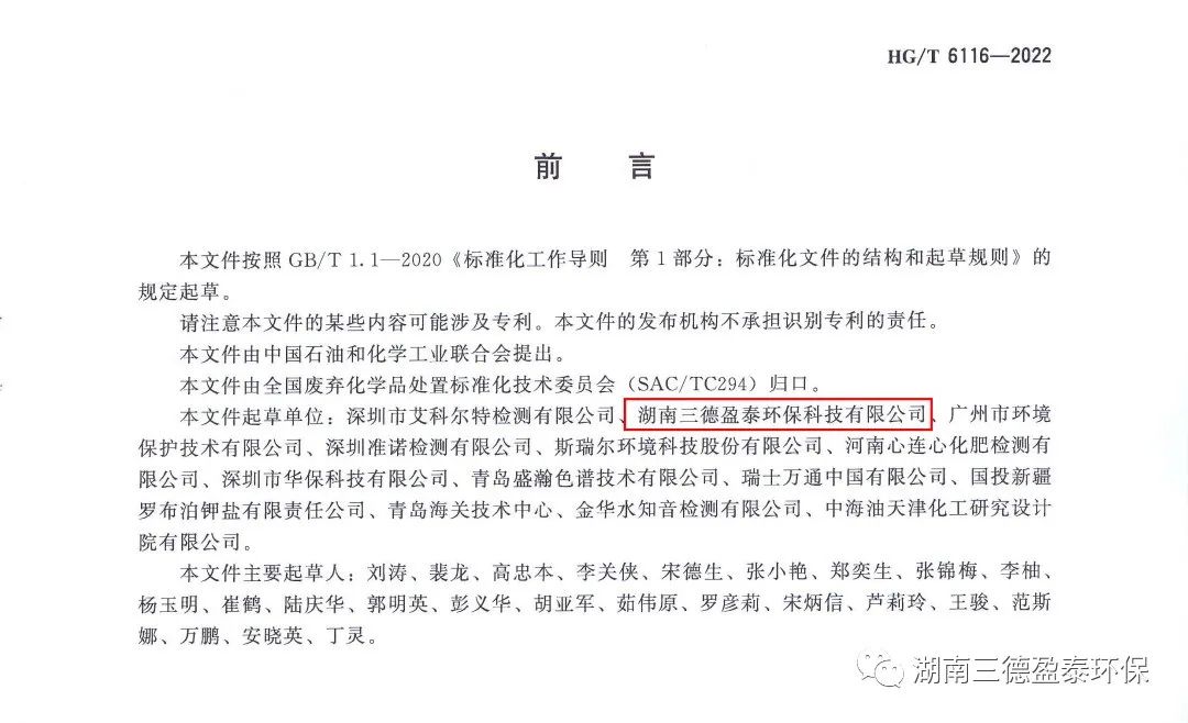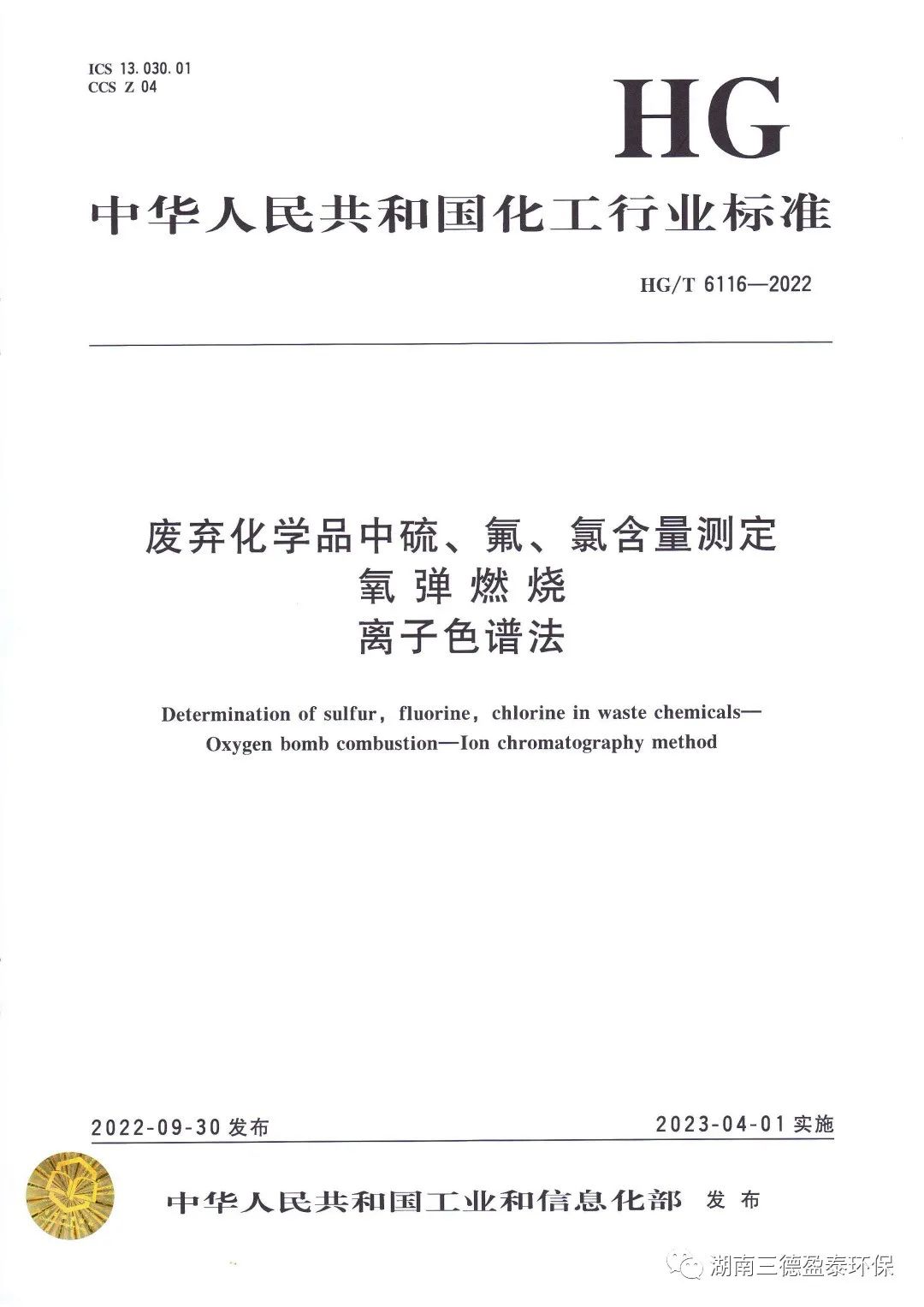 近日,盈泰环保参与制定的危废领域首个行业标准《废弃化学品中硫、氟、氯含量测定 氧弹燃烧 离子色谱法》(HG/T6116-2022)由国家工信部批准发布,将于2023年4月1日起实施。该标准规定了废弃化学品经氧弹燃烧处理后,通过离子色谱法测定硫、氟、氯含量的方法。