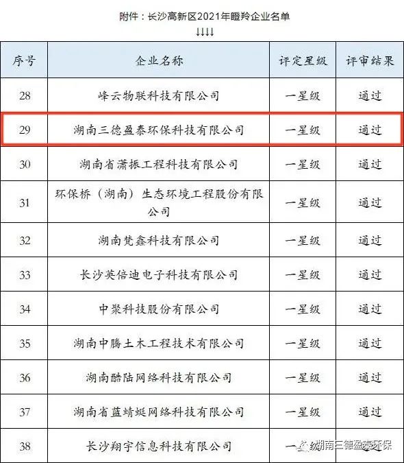 近日,长沙高新区公示了2021年瞪羚企业名单,湖南三德盈泰环??萍迹ㄒ韵录虺啤叭掠保┑?8家高成长企业入选。